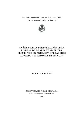 | Título: | Análisis de la perturbación de la inversa de Drazin de matrices, elementos en anillos y operadores acotados en espacios de Banach |