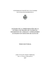 Resumen La generalización de la noción de inversa para trasformaciones lineales no invertibles ha sido estudiada por numerosos investigadores en los últimos años. Así, han sido definidas varias “pseudoinversas” para las matrices no invertibles. Dentro de estas, la inversa de Moore-Penrose, definida independientemente por Moore (1920) y por Penrose (1955), nos aporta la solución por mínimos cuadrados de norma mínima de un sistema singular lineal de ecuaciones algebraicas. Sin embargo, tal inversa no posee propiedades del tipo GA = AG, si A es un autovalor de A, entonces 1/A es un autovalor de G y, si A es semejante a G entonces A y G tienen los mismos valores singulares, donde G es la inversa de Moore-Penrose de A. En 1958, M. P. Drazin introduce, a partir de una definición algebraica, un nuevo tipo de inversa generalizada, la inversa de Drazin, que denotaremos por AD, la cual si posee las propiedades anteriores. En este trabajo nos centraremos en tal inversa. La inversa de Drazin presenta variadas e importantes aplicaciones en la resolución de sistemas lineales de ecuaciones diferenciales y ecuaciones lineales en diferencias, en la criptografía, en la teoría del control óptimo y en las cadenas de Markov. El buscador de Internet Google utiliza el algoritmo PageRank para ordenar los resultados de las búsquedas. Este algoritmo puede ser interpretado en términos de una cadena Markov, en la cual los estados son las páginas, y las transiciones entre los estados son los enlaces (links) entre las páginas de Internet. El vector estacionario de esta cadena de Markov, llamado vector PageRank, tiene como componentes las probabilidades de que una página sea visitada. Si T es la matriz de transición de una cadena de Markov, en teoría, toda la información de ésta puede ser extraída de la matriz A = T - I y de AD. Esta “pseudoinversa” es inestable respecto a perturbaciones, esto es, si Aj} con j = 1, 2,..., y A son n x n matrices tales que A,- -» A, entonces, en general, no se tiene que Af -»• AD. En [6], S. L. Campbell y C. D. Meyer, establecieron una condición necesaria y suficiente para la continuidad de la inversa de Drazin. Formularon que si Aj-> A, entonces Af -»• AD si y sólo si existe un entero positivo j0 tal que rg(Ak/) = rg(Ak), para j > j0 y para ciertos enteros positivos ká y k. En dicho documento señalaron la dificultad de obtener cotas del error para la perturbación de la inversa de forma similar a las formuladas para la inversa de Moore-Penrose, como fueron establecidas por G. W. Stewart, [86]. La razón de esta afirmación estaría en que es algo más complicado trabajar algebraicamente con esta inversa que con la inversa de Moore-Penrose. La inversa de Moore-Penrose posee un tipo de ley de cancelación (si GAB = GAC entonces AB = AC) que la inversa de Drazin no tiene. Además, la inversa de Drazin puede ser pensada en términos de la forma canónica de Jordán y, la forma de Jordán, no es una función continua de ¡nnxn ¡nnxn La perturbación de la inversa de Drazin ha sido estudiada por diversos autores dando cotas del error relativo \\BD - AD\\/\\AD\\ bajo la condición rg(Bs) = rg(Ak), siendo s y k los índices de Drazin de B y A, respectivamente. Cuando el valor de los índices es igual a uno, nos referimos a la perturbación del Grupo inverso, que denotaremos por AK Este caso es de especial interés dentro de la teoría de la inversa de Drazin. Bajo las hipótesis ind{B) = md(A) = 1 y rg(B) = rg(A), en [62, 91], se de¬dujeron estimaciones para ||5» - A»||/||A»||. Suponiendo md(B) = 1 e md(A) = k y, rg(B) = rg(Ak), en [16, 61, 95] fueron obtenidas nuevas cotas usando la norma espectral. El caso rg{Bs) = rg(Ak), donde s = %nd{B) y k = %nd{A) fue estudiado en [97, 98, 102]. Para elementos de un álgebra de Banach en [79] se halló una cota superior de En el marco de la teoría de operadores la perturbación de la inversa de Drazin ha sido estudiada en [14, 17]. En esta linea han trabajado varios autores, citemos entre otros a S. L. Campbell, N. Castro, J. J. Koliha, X. Li, C. D. Meyer, V. Rakocevic, Y. Wei y H. Wu. A continuación expondremos la estructura de este trabajo y los aspectos más relevantes tratados en este estudio. En el Capítulo 1 introduciremos las inversas generalizadas. También daremos una breve exposición cronológica de los logros más significados relacionados con la inversa de Drazin. En el Capítulo 2 se dan los conceptos y resultados más importantes acerca de la inversa de Drazin de matrices cuadradas que serán empleados en el desarrollo de los Capítulos 3 y 4. Se introducirá el concepto de proyección espectral asociada al autovalor 0 de una matriz cuadrada que denotaremos por A\ Diversos resultados que muestran el importante papel que juega en la teoría de la inversa de Drazin. En los Capítulos 3, 4, 5 y 6 se presenta la investigación realizada. En el Capítulo 3 se analiza en primer lugar la perturbación de la proyección espectral asociada al 0 en relación con la inversa de Drazin. Se considerarán los proyectores oblicuos de la forma Q = An + S y, bajo la condición I - S2 no singu¬lar, se caracterizarán las matrices perturbadas B tales que su proyección espectral asociada al 0, B*, verifican Bn = Q. Entre otros resultados, se verá que su inversa de Drazin verifica la fórmula BD = (I + S + AD(B - A))-lAD(I - S). A partir de esta, posteriormente se derivarán cotas superiores de ||5D|| y \\BD - AD\\/\\AD\\, en términos de \\S\\. Diversos casos serán estudiados. En la Sección 3.3 se introducirá la clase de matrices B e Cnxn las cuales satis¬facen la siguiente condición, para algún entero positivo s, (ca) : n(Bs) nM{Ak) = {0} y M{BS) n n(Ak) = {o}, donde A E Cnxn con k = ind(A). Probaremos que las condiciones (C8) y rg(Bs) = rg(Ak) = rg(AkBsAk) son equi¬valentes. Otras caracterizaciones serán dadas. Estudiaremos en primer lugar el caso s = 1. El Grupo inverso juega un papel importante 