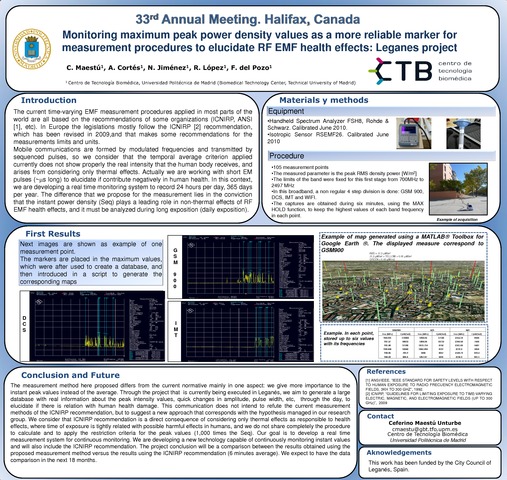 | Título: | Monitoring maximum peak power density values as a more reliable marker for measurement procedures to elucidate RF EMF health effects: Leganes project |