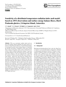| Título: | Sensitivity of a distributed temperature-radiation index melt model based on AWS observations and surface energy balance fluxes, Hurd Peninsula glaciers, Livingston Island, Antarctica |