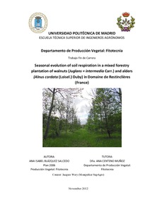 | Título: | Seasonal evolution of soil respiration in a mixed forestry plantation of walnuts (Juglans × intermedia Carr.) and alders (Alnus cordata (Loisel.) Duby) in Domaine de Restinclières (France) |