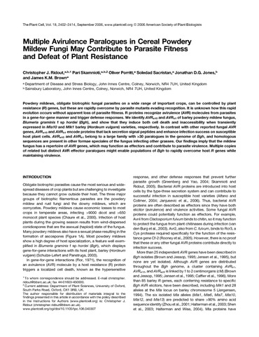 | Título: | Multiple avirulence paralogues in cereal powdery mildew fungi may contribute to parasite fitness and defeat of plant resistance |