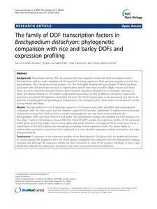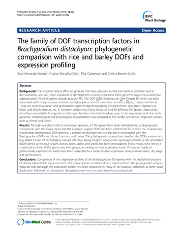 | Título: | The family of DOF transcription factors in Brachypodium distachyon: phylogenetic comparison with rice and barley DOFs and expression profiling |