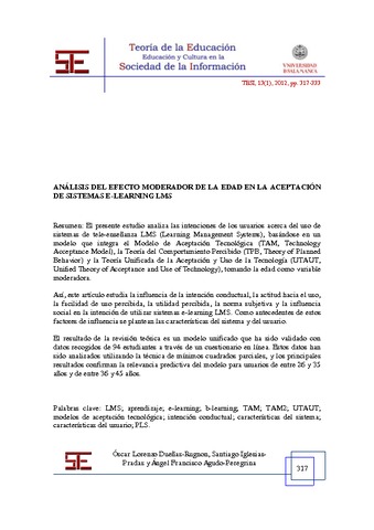 El presente estudio analiza las intenciones de los usuarios acerca del uso de sistemas de tele-enseñanza LMS (Learning Management Systems, basándose en un modelo que integra el Modelo de Aceptación Tecnológica (TAM, Technology Acceptance Model, la Teoría del Comportamiento Percibido (TPB, Theory of Planned Behavior) y la Teoría Unificada de la Aceptación y Uso de la Tecnología (UTAUT, Unified Theory of Acceptance and Use of Technology), tomando la edad como variable moderadora. Así, este artículo estudia la influencia de la intención conductual, la actitud hacia el uso, la facilidad de uso percibida, la utilidad percibida, la norma subjetiva y la influencia social en la intención de utilizar sistemas e-learning LMS. Como antecedentes de estos factores de influencia se plantean las características del sistema y del usuario. El resultado de la revisión teórica es un modelo unificado que ha sido validado con datos recogidos de 94 estudiantes a través de un cuestionario en línea. Estos datos han sido analizados utilizando la técnica de mínimos cuadrados parciales, y los principales resultados confirman la relevancia predictiva del modelo para usuarios de entre 26 y 35 años y de entre 36 y 45 años.