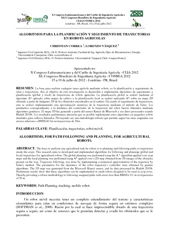 La base para realizar cualquier tarea agrícola mediante robots, es la planificación y seguimiento de rutas o trayectorias. Así, el objetivo de esta investigación es desarrollar e implementar algoritmos de seguimiento y planificación (global y local) de trayectorias de robots agrícolas. La planificación global se realizó mediante el algoritmo A* aplicado sobre mapas de cultivo y la planificación local se realizó aplicando A* sobre un mapa 2D obtenido a partir de imágenes 3D de los obstáculos encontrados en el camino. En cuanto el seguimiento de trayectorias, esta se realizó implementando una aproximación numérica de la trayectoria mediante el método de Euler. Los parámetros correspondientes a la dinámica del controlador de la trayectoria del robot fueron obtenidos mediante algoritmos genéticos. El mapa 3D fue generado a partir del sensor Kinect de Microsoft y sus datos procesados usando Matlab 2010b. Los resultados preliminares muestran que es posible implementar estos algoritmos en pequeños robots diseñados para cultivos hilerados. Proveyendo así, una metodología robusta que permite seguir las rutas asignadas con errores inferiores a RMSE=0.1m en trayectorias de 30m.