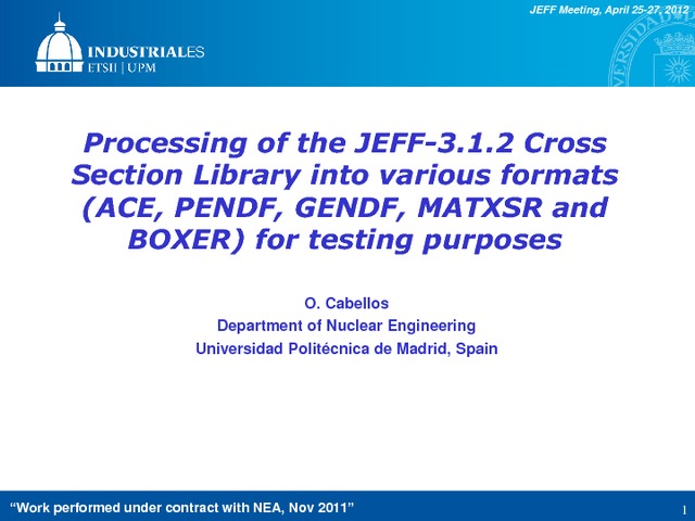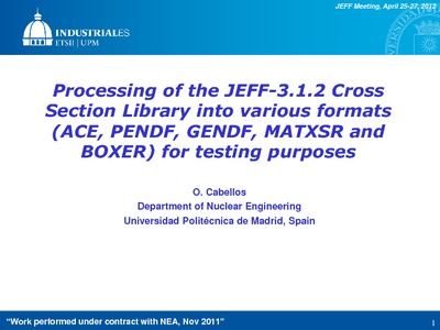 | Título: | Processing of the JEFF-3.1.2 Cross Section Library into various formats (ACE, PENDF, GENDF, MATXSR and BOXER) for testing purposes |
