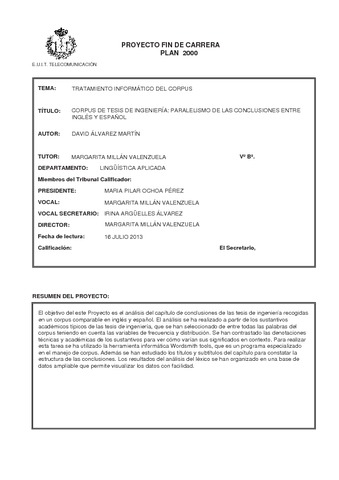 El objetivo de este Proyecto Fin de Carrera es abordar el análisis del capítulo de conclusiones de tesis de ingeniería de telecomunicación a partir de un corpus comparable en
