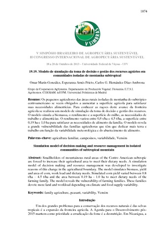 Os pequenos agricultores das áreas rurais isoladas de montanha do subtrópico centroamericano se veem obrigados a aumentar a superfície agrícola para satisfazer suas necessidades alimentícias. Para conhecer as raçoes deste avance da fronteira agrícola se realizou um modelo de simulação da toma de decisão e gestão dos recursos. O modelo simula a biomassa, o rendimento e a superfície do milho, as necessidades de trabalho e alimentícias. O rendimento variou entre 0,8 t/ha e 4,5 t/ha, a superfície entre 0,19 ha e 1,0 ha para satisfazer as necessidades de alimento da família. O modelo revela a grande vulnerabilidade das famílias agricultoras que têm que dedicar mais terra e trabalho em função da variabilidade meteorológica e do abastecimento de alimento.