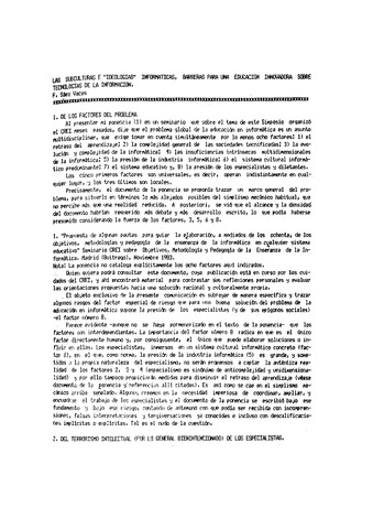 Al presentar mi ponencia (1) en un seminario que sobre el tema de este Simposio organizó el CREI meses pasados, dije que el problema global de la educación en informática es un asunto Multidisciplinar, que exige tomar en cuenta simultáneamente por lo menos ocho factores, 1) el