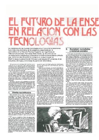 La incidencia de las nuevas tecnologías en el futuro de la enseñanza fue el hilo argumentativo de la ponencia presentada por el catedrático de la Escuela Técnica Superior de Ingenieros de Telecomunicaciones, Fernando Sáez Vacas, en el curso de las Jornadas sobre Informática y Educación en la Enseñanza Básica y Media que, entre los días 26 al 28 de noviembre, tuvieron lugar en Madrid, bajo el patrocinio del Ministerio de Educación y Ciencia, el de Industria y Energía y el Consejo Superior de informática.