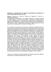 El uso intensivo de compuestos de cobre como herbicidas y fungicidas provoca la contaminación de suelos de uso agrícola debido a la acumulación de este metal en las capas más superficiales del suelo. Se sabe que la presencia de cobre y otros metales pesados afecta negativamente a las interacciones simbióticas que se establecen entre bacterias diazotróficas de los géneros Rhizobium, Sinorhizobium y Bradyrhizobium y leguminosas de interés agrícola (Laguerre et al., 2006). El objetivo de este trabajo es estudiar la diversidad de cepas endosimbióticas de leguminosas en suelos agrícolas chilenos que presentan un elevado contenido en cobre como resultado de la contaminación con residuos de extracciones mineras. Además, se pretende caracterizar el nivel de resistencia a cobre en las cepas aisladas con objeto de identificar aquellas altamente eficientes que puedan ser utilizadas como inoculantes microbianos. Para ello, se han prospectado 9 suelos agrícolas de las regiones III, V y VI de Chile con contenidos muy variables de metales. Utilizando estos suelos como inóculos de plantas trampa de leguminosas se ha obtenido una colección de 362 cepas aisladas de nódulos de guisante (Pisum sativum), judía (Phaseolus vulgaris) y alfalfa (Medicago sativa). Los análisis filogenéticos y los ensayos de resistencia a cobre realizados han permitido caracterizar y seleccionar aquellas cepas con mayores niveles de resistencia a este metal. Los resultados demuestran que los suelos altamente contaminados por cobre poseen una menor diversidad de bacterias endosimbióticas; las cepas más resistentes han sido aisladas de los suelos con niveles de contaminación intermedia. Los análisis fenotípicos y moleculares realizados sobre las cepas más resistentes han demostrado la existencia de sistemas de resistencia a cobre inducibles por este metal y potencialmente implicados en su homeostasis.