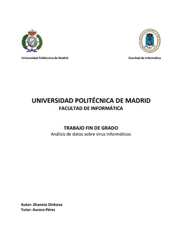 El trabajo fin de grado que se presenta en este documento trata de “Aplicar técnicas de Data Mining a un conjunto de datos procedentes de ataques de virus informáticos interceptados en servidores de Internet”. La propuesta de este trabajo surgió de una Institución con el fin de extraer información de un conjunto de datos proveniente de ejecuciones de virus informáticos. Lamentablemente, debido a fuertes restricciones de privacidad por parte de esta Institución y así como al relevo de la persona responsable de éste área en dicha Institución, el Proyecto finalmente se canceló. Como consecuencia, y teniendo en cuenta el carácter didáctico de este trabajo fin de grado, el proyecto KDD (Knowledge Discovery in Databases) en sí y sus objetivos de negocio y objetivos de data mining, se han establecido conforme con la misma temática de predicción de ataques de virus que había planteado la Institución en el pasado, contando con una base de datos que ha sido recopilada de diferentes empresas anónimas. Para llevar un desarrollo estructurado de todas las fases del proceso KDD, se ha trabajado siguiendo como referencia una metodología para proyectos de Data Mining, “CRISP-DM”, cuyo estándar incluye un modelo y una guía, estructurados en seis fases. Como herramienta de Data Mining a utilizar, se ha elegido el software de libre distribución “WEKA”. Por último, cabe destacar que el proyecto ha concluido satisfactoriamente, lográndose cada una de las metas establecidas como proyecto de minería de datos.
