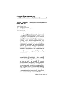 Este trabajo presenta una descripción de los blogs de Telecomunicación como género. A través del análisis de frases léxicas se llega a conclusiones sobre algunas de las características que definen la lengua que se usa en este tipo de textos y se comparan los resultados obtenidos con otros previos sobre el discurso escrito y el conversacional. Aunque la hipótesis de partida es que los artículos de los blogs son básicamente transaccionales, donde el principal objetivo es transmitir información, los resultados llevan a conclusiones sobre la importancia de la interacción en este tipo de discurso y también apuntan a una mayor organización de la esperable en las entradas de los comentarios al artículo principal del blog.