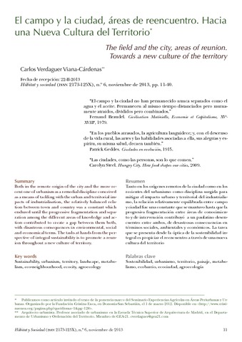 English Summary: Both in the remote origin of the city and the more recent one of urbanism as a remedial discipline conceived as a means of tackling with the urban and territorial impacts of industrialisation, the relatively balanced relation between town and country was a constant which endured until the progressive fragmentation and separation among the different areas of knowledge and action contributed to create a gap between them both, with disastrous consequences in environmental, social and economical terms. The tasks at hands from the perspective of integral sustainability is to promote a reunion throughout a new culture of territory. Resumen Tanto en los orígenes remotos de la ciudad como en los recientes del urbanismo como disciplina surgida para mitigar el impacto urbano y territorial del industrialismo, la relación relativamente equilibrada entre campo y ciudad fue una constante que se mantuvo hasta que la progresiva fragmentación entre áreas de conocimiento y de intervención contribuyó a un paulatino desencuentro entre ambos, de desastrosas consecuencias en términos sociales, ambientales y económicos. La tarea que se presenta desde la óptica de la sostenibilidad integral es propiciar el reencuentro a través de una nueva cultura del territorio