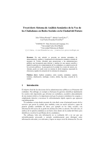 | Título: | TweetAlert: Sistema de análisis semántico de la voz de los ciudadanos en redes sociales en la ciudad del futuro |