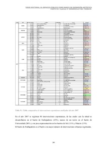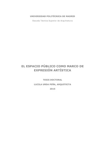 La tesis indaga sobre la capacidad del arte como elemento de transformación de la ciudad. La práctica cada vez más común de la instalación de obras de arte efímero en el espacio público de las ciudades produce alteraciones reales del paisaje urbano. En el caso de la ciudad de Madrid la proliferación de obras de arte efímero en sus calles y plazas más céntricas se ha materializado de forma intensa desde los primeros años del siglo XXI. Este trabajo de investigación estudia un intervalo de cinco años representativos para Madrid (2007-2011) por la cantidad y la trascendencia de las intervenciones de arte público temporal y de arte urbano en su espacio público. Con la recopilación, el análisis, la categorización y evaluación de casi trescientos ejemplos de manifestaciones artísticas efímeras en Madrid se establecen conclusiones sobre la repercusión del arte en la transformación de ciertos procesos urbanos. La constatación de la existencia de un movimiento de arte urbano en el siglo XXI permite tratar un tema necesario en el momento actual: la revitalización del espacio urbano a través del arte. La tesis trata de describir conceptualmente una forma novedosa de arte que puede ser un motor de procesos participativos urbanos directos y decisorios. ABSTRACT This thesis makes a research about the ability of art as an element of transformation inside the city. The increasingly common practice of ephemeral art installations in urban public spaces is provoking real changes in the cities landscape. In the case of Madrid the proliferation of ephemeral artworks in the most busy streets and squares has been brought into life as an intense activity from the first years of the 21st century. This research paper studies a span of five years which have been quite representative to Madrid (2007-2011) because of the big amount of meaningful interventions that have taken place both as temporary art and as urban art in its public spaces. Through data-gathering, analysis, classification and assessment of almost three hundred examples of ephemeral art forms in Madrid, several conclusions can be stated on the impact of art in transforming certain urban processes. This evidence of the existence of an urban art movement in the 21st century opens a necessary debate subject at this moment: the regeneration of urban space through art. This thesis aims at conceptually describe this newborn artistic expressions of art, seen as a driving force for providing more direct and participatory urban decision-making processes.