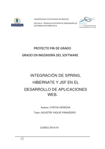 Este proyecto está centrado en investigar la utilización de los frameworks de Java Spring,Hibernate y JSF en el desarrollo de aplicaciones web. Para poder analizar sus ventajas e inconvenientes, he realizado un caso práctico, una aplicación web llamada “Votación de Product Box”. Las primeras dos secciones de este proyecto son este resumen del proyecto y un abstract, es decir, este mismo resumen, en inglés. En la introducción (sección tercera), definiré los objetivos del proyecto, luego en la cuarta sección explicaré las características principales de cada framework, destacando sus ventajas. Una vez presentados los frameworks, paso a explicar el caso práctico, definiendo los requisitos de la aplicación Web y sus casos de uso en la quinta sección. Describo el entorno de desarrollo, las herramientas utilizadas y la razón por las cuales las he elegido en la sexta sección. Ahora explico cómo he realizado la integración de los tres frameworks en la aplicación (sección séptima) y la relaciono por medio de diagramas de clase y de entidad-relación (sección octava). Por último he realizado un tutorial de uso de la aplicación Web (sección novena), he sacado las conclusiones de haber trabajado con estos frameworks, qué ventajas e inconvenientes he encontrado y qué he aprendido a lo largo de este proyecto (sección décima),y he referenciado una bibliografía por si se quiere profundizar en el estudio de estos frameworks (sección undécima). ABSTRACT This project focuses on investigating the use of Java frameworks Spring, JSF and Hibernate on the development of Web applications. To analyze their advantages and disadvantages, I have made a practical example, a website called “Votación de Product Box”. The first two sections of this project are the project summary and abstract (the same summary in English). In the introduction (section three), I define the project goals, and then, in the fourth section, I explain the main features of each framework, emphasizing on its advantages. After introducing the frameworks, I explain the study case, I gather requirements and I make use cases in the fifth section. I describe the development environment, the tools used and the reason why I have chosen them in the sixth section. So I can explain how I made the integration of the three frameworks in the application (section seventh) and relate through class diagrams and entity relationship (section eight). Finally I make a tutorial to use the Web application (Section ninth), I draw to the conclusions of working with these frameworks, which advantages and disadvantages I have found, and I what things I learned through this project (tenth section) and I have a referenced bibliography just in case you want to find out some more about these frameworks (section eleven).