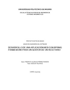 The second part, the development of the web application, serves as a practical demonstration of how to use the knowledge gleaned about Spring. An application will be developed to manage a cookbook generated by a community of users. The application has a set of users who have to authenticate themselves to be able to see their personal data and modify it if they wish to do so. Depending on the user type, the user will be able to access different parts of the application and will have a different set of possible actions. The main possible actions are: creation recipes, modification or deletion of owned recipes and the modification and deletion of any recipe. The recipes consist its name, a description, a photograph, estimated times and difficulties, a list of ingredients along with their quantities and lastly a series of steps to follow along with demonstrative photographs if desired; and other information such as categories or difficulties. The administrators, a specific type of users, will have access to a list of users where they can monitor them, modify them or grant and remove privileges.