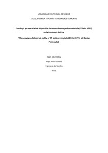 La aparición y avance de la enfermedad del marchitamiento del pino (Pine Wilt Desease, PWD), causada por Bursaphelenchus xylophilus (Nematoda; Aphelenchoididae), el nematodo de la madera del pino (NMP), en el suroeste de Europa, ha puesto de manifiesto la necesidad de estudiar la fenología y la dispersión de su único vector conocido en Europa, Monochamus galloprovincialis (Col., Cerambycidae). El análisis de 12 series de emergencias entre 2010 y 2014, registradas en Palencia, València y Teruel, con material procedente de diversos puntos de la península ibérica, demostró una alta variabilidad en la fenología de M. galloprovincialis y la divergencia térmica respecto de las poblaciones portuguesas. Para éstas, el establecimiento de los umbrales térmicos de desarrollo de las larvas post-dormantes del vector (12,2 y 33,5ºC) permitió la predicción de la emergencia mediana para la fecha en la que se acumulaban de 822 grados-día. Ninguna de las series analizadas en este trabajo necesitó de dichos grados-día estimados para la emergencia mediana. Asimismo, la emergencia se adelantó en las regiones más calurosas, mientras que se retrasó en las zonas más templadas. Más allá de la posible variabilidad entre poblaciones locales peninsulares, se detectaron indicios de que la diferencia en la acumulación de calor durante el otoño puede afectar el grado de maduración de las larvas invernantes, y su posterior patrón temporal de emergencia. Por último, también fueron observados comportamientos de protandria en las emergencias. Respecto a la fenología de su vuelo, entre los años 2010 y 2015, fueron ejecutados un total de 8 experimentos de captura de M. galloprovincialis mediante trampas cebadas con atrayentes en diferentes regiones (Castellón, Teruel, Segovia y Alicante) permitiendo el seguimiento del periodo de vuelo. Su análisis permitió constatar la disminución de las capturas y el acortamiento del periodo de vuelo con la altitud, el inicio del vuelo en el mes de mayo/junio a partir de los 14ºC de temperatura media diaria, la influencia de las altas temperaturas en la disminución de las capturas estivales (potencial causante de perfiles bimodales en las curvas de vuelo en las zonas menos frías), la evolución de la proporción de sexos a lo largo del periodo de vuelo (que muestra una mayor captura de hembras al inicio y de machos al final) y el comportamiento diurno y ligado a las altas temperaturas del vuelo circadiano del insecto. Dos redes de muestreo sistemático de insectos saproxílicos instaladas en la Comunitat Valencia (Red MUFFET, 15 parcelas, año 2013) y en Murcia (Red ESFP, 20 parcelas, años 2008-2010) permitieron el estudio de la comunidad de insectos relacionada con M. galloprovincialis. Cada una de las parcelas contaba con una trampa cebada con atrayentes y una estación meteorológica. El registro de más de 250 especies de coleópteros saproxílicos demostró el potencial que tiene el empleo de redes de trampas vigía para la detección temprana de organismos exóticos, además de permitir la caracterización y evaluación de las comunidades de entomofauna útil, representando una de las mejores herramientas de la gestión integrada de plagas. En este caso, la comunidad de saproxílicos estudiada mostró ser muy homogénea respecto a la variación ambiental de las zonas de muestreo, y que pese a las pequeñas variaciones entre las comunidades de los diferentes ecosistemas, el rol que M. galloprovincialis desempeña en ellas a lo largo de todo el gradiente estudiado es el mismo. Con todo, el análisis mediante redes de interacción mostró su relevancia ecológica al actuar de conector entre los diferentes niveles tróficos. Por último, un total de 12 experimentos de marcaje-liberación-recaptura desarrollados entre 2009 y 2012 en Castellón, Teruel, Valencia y Murcia permitieron evaluar el comportamiento dispersivo de M. galloprovincialis. Las detecciones mediante trampas cebadas de los insectos liberados se dieron por lo menos 8 días después de la emergencia. La abundancia de población pareció relacionada con la continuidad, la naturalización de la masa, y con la afección previa de incendios. La dispersión no estuvo influida por la dirección ni la intensidad de los vientos dominantes. La abundancia de material hospedante (en lo referente a las variables de masa y a los índices de competencia) influyó en la captura del insecto en paisajes fragmentados, aunque la ubicación de las trampas optimizó el número de capturas cuando se ubicaron en el límite de la masa y en zonas visibles. Por último también se constató que M. galloprovincialis posee suficiente capacidad de dispersión como para recorrer hasta 1500 m/día, llegando a alcanzar distancias máximas de 13600m o de 22100 m. ABSTRACT The detection and expansion of the Pine Wilt Desease (PWD), caused by Bursaphelenchus xylophilus (Nematoda; Aphelenchoididae), Pine Wood Nematode (PWN), in southwestern Europe since 1999, has triggered off the study of the phenology and the dispersion of its unique vector in the continent, Monochamus galloprovincialis (Coleoptera, Cerambycidae). The analysis of 12 emergence series between 2010 and 2014 registered in Palencia, Teruel and Valencia (Spain), registered from field colonized material collected at several locations of the Iberian Peninsula, showed a high variability in the emergence phenology of M. galloprovincialis. In addition, these patterns showed a very acute thermal divergence regarding a development model fitted earlier in Portugal. Such model forecasted the emergence of 50% of M. galloprovincialis individuals in the Setúbal Peninsula (Portugal) when an average of 822 degree-days (DD) were reached, based on the accumulation of heat from the 1st of March until emergence and lower and upper thresholds of 12.2 ºC and 33,5 °C respectively. In our results, all analyzed series needed less than 822 DD to complete the 50% of the emergen