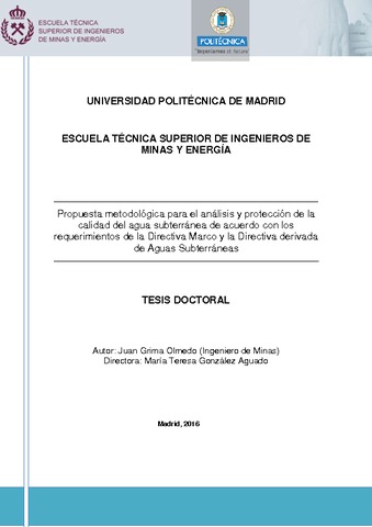 | Título: | Propuesta metodológica para el análisis y protección de la calidad del agua subterránea de acuerdo con los requerimientos de la Directiva Marco y la Directiva derivada de Aguas Subterráneas |
