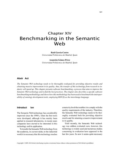 The Semantic Web technology needs to be thoroughly evaluated for providing objective results and obtaining massive improvement in its quality; thus, the transfer of this technology from research to industry will speed up. This chapter presents software benchmarking, a process that aims to improve the Semantic Web technology and to find the best practices. The chapter also describes a specific software benchmarking methodology and shows how this methodology has been used to benchmark the interoperability of ontology development tools, employing RDF(S) as the interchange language.