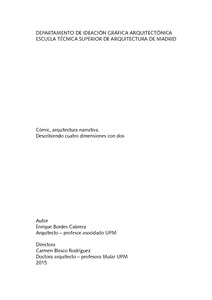 Cómic, arquitectura narrativa. Describiendo cuatro dimensiones con dos. La mayor parte de los estudios con un enfoque académico en torno a cómic y arquitectura, se han centrado más en las distintas realidades representadas dentro del medio, en sus decorados, que en la estructura del cómic en sí. Existe un aspecto gráfico que se ha venido obviando o al menos no ha adquirido el protagonismo que merece: los espacios representados en el cómic se encuentran en un medio que se concibe y estructura de una manera similar a como el arquitecto dibuja y concibe la arquitectura. En lo básico, históricamente, las herramientas y soportes para idear y representar la arquitectura son muy parecidas a aquellas que usa el autor de cómic. Lápiz, tinta y color sobre un papel, combinadas trabajando en un tablero, ese es lugar de nacimiento de ambos mundos. A lo largo de esta tesis se muestra cómo el dibujo une a creadores de narraciones gráficas y edificios. La relación va más allá de que el cómic pueda utilizar las disposiciones vitruvianas, ichnographia, ortographia o scenographia, (planta, alzado, perspectiva), la propia articulación que hace del espacio de la página, puede sintonizar con la manera en la que se concibe una estructura arquitectónica. La tesis inicia con un capítulo de recorrido en torno a las teorías del cómic existentes, buscando intersecciones posibles con la representación arquitectónica o el proyecto espacial. En este primer paso de estudio del estado de la cuestión han pesado más los trabajos de los últimos veinticinco años. Se trata de un periodo en el que, a la par que se ha producido una explosión creativa en el mundo del cómic, determinados teóricos han incidido en un análisis más formal y visual del medio. Tras recoger teorías en el primer capítulo, se plantea un recorrido histórico a la búsqueda de posibles resonancias de “arquitecturas mentales” en el pasado. Esta búsqueda de referentes más allá del siglo XIX, momento en el que nace el medio en su forma actual, es ya un aspecto comúb en distintos estudios de cómic que han servido de inspiración. Se ha preferido ubicar esta colección de antecedentes como segundo capítulo, evitando dar al trabajo un carácter de historia e incidiendo en su enfoque de tipo visual. El tercer capítulo analiza una serie de obras y autores de cómic en su forma actual, buscando distintas estrategias para la descripción de espacios y las narraciones que ocurren en ellos. El crecimiento de casos en estas últimas décadas ha demostrado hasta qué punto el desarrollo de un campo depende tanto de que exista una masa crítica en un contexto conectado y productivo, como de la aparición de individuos que abren puertas a los demás, con la cristalización personal que hacen de una situación. Se analiza en un cuarto capítulo la relación entre la arquitectura y el cómic modernos. Una relación que se presenta partiendo desde sus respectivos padres, para después tratar un elenco creciente de experiencias en el que la narración gráfica y el hecho arquitectónico estan íntimamente ligados. Inspirado en la estrategia que Gubern y Gasca utilizan en El discurso del cómic (Cátedra, 1988) se cierra la tesis con un discurso visual por las arquitecturas mentales y narrativas del cómic: la representación del espacio a través de juego con las dimensiones, el uso de recursos gráficos propios de la descripción arquitectónica, la sección, la planta, la utilización de elementos constructivos,etc, completando el abanico de estrategias gráficas presentadas. ABSTRACT Comic narrative architecture. Describing four dimensions with two Most of the studies with an academic focus around comics and architecture have centered their view more on the different realities represented in the media, in its sets, than in the structure of comics itself. There is a graphic aspect that has been ignored, or at least has not gained the prominence it deserves: the spaces rendered in the comics are set in a medium that is conceived and structured in a similar way as the architect draws and conceives architecture. In basics, tools for designing and representing architecture are very similar to those used by the cartoonist. Pencil, ink and color on paper, combined working on a board, that is birthplace of both worlds. Throughout this thesis its shown how drawing connects creators of graphic stories and buildings. The relationship goes beyond the use that comics can do of the Vitruvian provisions, ichnographia, ortographia or scenographia (plan, elevation, perspective), to the arrange itself that it makes with space on the page, in tune with the way in which architectural structures are conceived. The thesis starts with a chapter that collects existing comics theories and their possible intersection with architectural rendering. In this first step of study on the state of affairs, the focus has been over studies from the last twenty years. It is a period in which, at the same time that there has been a creative explosion in the world of comics, some theorists have worked with a more formal and visual approach. After collecting theories in the first chapter, a historical tour is made to search for possible resonances of “mental architectures” in the past. This search for references beyond the nineteenth century, when the medium was born in its current form, is already a regular process in various recent studies that have served as inspiration. We preferred to locate this as a second chapter, to avoid giving the work a character of History, and reenforcing its visual approach. The third chapter analyzes a series of comics and authors, looking for different strategies for describing spaces and stories that occur in them. The growth of cases in recent decades has shown how the development of a field depends both on the existence of a critical mass in a connected and productive enviroment, and the appearance of individuals who open do