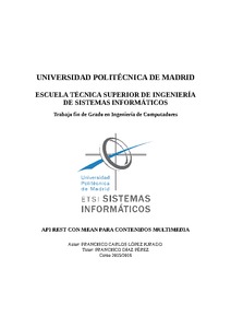 Memoria de Proyecto Fin de Grado API REST con MEAN para Contenidos Multimedia. En ella se especifica todo el proceso de elaboración del proyecto, desde la confección de la idea, pasando por el análisis y la definición de requisitos de elaboración, hasta la entrega definitiva del producto final. El proyecto consta de dos bloques claramente diferenciados: Una documentación extensa de la línea de trabajo, con apoyo de diagramas, imágenes, descripciones y metodologías. Implementación de la línea de trabajo. Elaboración de una aplicación SW que presente una correspondencia con la temática del proyecto, la intención del mismo y los requisitos que se espera que la solución software satisfaga. Al ser un proyecto software, se ha seguido estándares de elaboración con la mayor fidelidad. Estos estándares de elaboración son tanto de documentación como de metodologías. La evolución del proyecto ha pasado por diferentes etapas. Las principales son las de análisis y recopilación de requisitos, diseño de la arquitectura, implementación de la solución software y validación de la misma.
