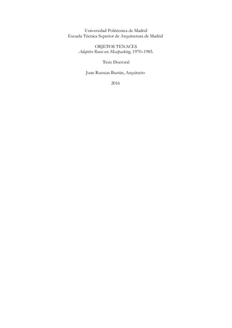 OBJETOS TENACES versa sobre la práctica del adaptive reuse (la “reutilización adaptativa”, la reconversión) explicado a través del fenómeno de ruptura, suspensión y reconfiguración de vínculos que el objeto arquitectónico tiene con respecto a su medio económico, sociocultural, normativo y de utilitas. Se trata de un fenómeno en tres fases, muy próximo al mecanismo empleado por el readymade y por el display, que en arquitectura parte de la crisis que supone un cambio de circunstancias, un desarraigo del objeto respecto de su ámbito anterior. El mecanismo tiene vocación de intervención mínima, desde un posicionamiento actual que comprende el mundo construido como una realidad “ya hecha”, y donde las operaciones de proyecto son acciones de transformación que llevan de una situación de obsolescencia a otra de vigencia renovada, es decir, de una realidad completa a otra igualmente completa. Para ello, la investigación se sirve de tres ejemplos de un mismo entorno geográfico (el área en torno a Meatpacking, en el lado oeste del bajo Manhattan, Nueva York) y temporal (las últimas décadas del siglo XX, en las que los casos se solapan a pesar de tener desarrollos cronológicos diversos). Bell Telephone Laboratories, The West Side Improvement y The National Biscuit Company, reconvertidos a Westbeth, a The High Line y a Chelsea Market, construyen juntos el argumento por suma de conceptos, por adición de fenómenos, estudiando las cualidades y las circunstancias que hacen posible la continuidad de las estructuras, es decir, su supervivencia. El texto forma un corpus que proporciona algunas de las claves del objeto denominado como tenaz a través del análisis sincrónico del antes y el después de su puesta en crisis. A tal efecto, se exponen una serie de figuras razonadas entre las cuales figuran el lijado del barniz, los hilos compartidos, la máscara, la momificación y la vitrina, el puente sobre le desfiladero, el enfriamiento, o las reliquias, incrustaciones y adherencias, todas ellas encaminadas a explicar el proceso de renovación del artefacto como un cambio en el sentido, en el significado, y no tanto en lo material. Entre las consideraciones de la tesis está, por un lado, el carácter relativo del término tenacidad, concepto que define a los objetos que se encuentran y se reconocen en su idoneidad, que tienen capacidad de adaptación, y que precisan finalmente de grandes dosis de pragmatismo para su reconfiguración, siendo todas éstas condiciones necesarias pero sólo suficientes a posteriori. Por otro lado, el texto reflexiona acerca del intangible que comparten todos los objetos así llamados y que consiste en la condición, quizá formidable, de ser reconocibles por parte de los sucesivos intervinientes de su historia, convencidos de que su renovación supone una oportunidad; su desaparición, una pérdida. Finalmente, la investigación apunta hacia el concepto de anacronismo como justificación para los objetos que se demuestran adaptables a épocas sucesivas, y que encajan en el tiempo de forma compleja. ABSTRACT TENACIOUS OBJECTS deals with the practice of the adaptive reuse explained by means of the phenomenon of rupture, suspension and reconfiguration of links that the architectural object has vis-à-vis its economic, socio-cultural and regulatory environment, and its utilitas. It is a phenomenon structured in three stages, very close to the mechanism used by the readymade and by the display, which in architecture arise from the crisis that leads to a change in circumstances, an alienation of the object regarding its previous environment. The mechanism aims to the minimum intervention, from a current positioning which understands the world built as a reality “already made”, and where the operations of the project are transformative actions that take us from a situation of obsolescence to a situation of renewed validity, that is, from a complete reality to one just as complete. For this purpose, the research makes use of three examples in the same geographical area (the Meatpacking Discrict, in the Lower West Side of Manhattan, New York) and the same period (the last decades of the 20th century, in which the cases overlap in spite of their diverse chronological developments). Bell Telephone Laboratories, The West Side Improvement and The National Biscuit Company, reconverted into Westbeth, The High Line and Chelsea Market, make up, together, the argument as a sum of concepts, and addition of phenomena, studying the qualities and circumstances which make the continuity of the structures possible, that is, their survival. The text forms a corpus that provides some of the keys of the so-called tenacious object by means of the synchronic analysis of before and after its crisis. To this end, a series of reasoned figures is presented, including the sanding of varnish, the shared threads, the mask, the mummification and the display cabinet, the bridge over the gorge, cooling, or the relics, incrustations and adherences, all of them aimed at explaining the renovation process of the artifact as a change in the sense and the meaning, rather than the material. The considerations of this dissertation include, on the one hand, the relative nature of the term tenacity, a concept which defines the objects found and recognized in their suitability, that are capable of adapting and which finally require large doses of pragmatism for their reconfiguration, all these conditions being necessary but only sufficient a posteriori. On the other hand, the text reflects on the intangible shared among all the so-called objects, and which consists of the condition, perhaps extraordinary, of being recognized by the subsequent interveners of their history, convinced that their renovation represents an opportunity; their disappearance, a loss. Finally, the dissertation studies the concept of anachronism as a justification for the objects that prove to adapt to subsequent p