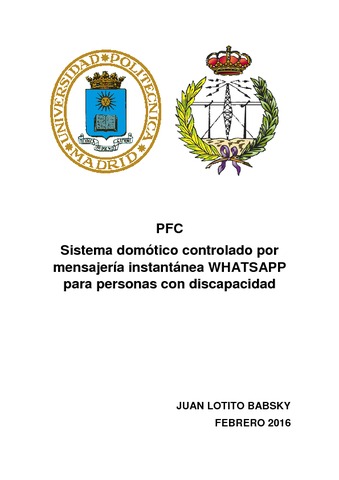 El presente PFC tiene como objetivo el desarrollo de un gestor domótico basado en el dictado de voz de la red social WhatsApp. Dicho gestor no solo sustituirá el concepto dañino de que la integración de la domótica hoy en día es cara e inservible sino que acercará a aquellas personas con una discapacidad a tener una mejora en la calidad de vida. Estas personas, con un simple comando de voz a su aplicación WhatsApp de su terminal móvil, podrán activar o desactivar todos los elementos domóticos que su vivienda tenga instalados, “activar lámpara”, “encender Horno”, “abrir Puerta”… Todo a un muy bajo precio y utilizando tecnologías OpenSource El objetivo principal de este PFC es ayudar a la gente con una discapacidad a tener mejor calidad de vida, haciéndose independiente en las labores del hogar, ya que será el hogar quien haga las labores. La accesibilidad de este servicio, es por tanto, la mayor de las metas. Para conseguir accesibilidad para todas las personas, se necesita un servicio barato y de fácil aprendizaje. Se elige la red social WhatsApp como interprete, ya que no necesita de formación al ser una aplicación usada mayoritariamente en España y por la capacidad del dictado de voz, y se eligen las tecnologías OpenSource por ser la gran mayoría de ellas gratuitas o de pago solo el hardware. La utilización de la Red social WhatsApp se justifica por sí sola, en septiembre de 2015 se registraron 900 millones de usuarios. Este dato es fruto, también, de la reciente adquisición por parte de Facebook y hace que cumpla el primer requisito de accesibilidad para el servicio domotico que se presenta. Desde hace casi 5 años existe una API liberada de WhatsApp, que la comunidad OpenSource ha utilizado, para crear sus propios clientes o aplicaciones de envío de mensajes, usando la infraestructura de la red social. La empresa no lo aprueba abiertamente, pero la liberación de la API fue legal y su uso también lo es. Por otra parte la empresa se reserva el derecho de bloquear cuentas por el uso fraudulento de su infraestructura. Las tecnologías OpenSource utilizadas han sido, distribuciones Linux (Raspbian) y lenguajes de programación PHP, Python y BASHSCRIPT, todo cubierto por la comunidad, ofreciendo soporte y escalabilidad. Es por ello que se utiliza, como matriz y gestor domotico central, una RaspberryPI. Los servicios que el gestor ofrece en su primera versión incluyen el control domotico de la iluminación eléctrica general o personal, el control de todo tipo de electrodomésticos, el control de accesos para la puerta principal de entrada y el control de medios audiovisuales. ABSTRACT. This final thesis aims to develop a domotic manager based on the speech recognition capacity implemented in the social network, WhatsApp. This Manager not only banish the wrong idea about how expensive and useless is a domotic installation, this manager will give an opportunity to handicapped people to improve their quality of life. These people, with a simple voice command to their own WhatsApp, could enable or disable all the domotics devices installed in their living places. “On Lamp”, “ON Oven”, “Open Door”… This service reduce considerably the budgets because the use of OpenSource Technologies. The main achievement of this thesis is help handicapped people improving their quality of life, making independent from the housework. The house will do the work. The accessibility is, by the way, the goal to achieve. To get accessibility to a width range, we need a cheap, easy to learn and easy to use service. The social Network WhatsApp is one part of the answer, this app does not need explanation because is used all over the world, moreover, integrates the speech recognition capacity. The OpenSource technologies is the other part of the answer due to the low costs or, even, the free costs of their implementations. The use of the social network WhatsApp is explained by itself. In September 2015 were registered around 900 million users, of course, the recent acquisition by Facebook has helped in this astronomic number and match the first law of this service about the accessibility. Since five years exists, in the internet, a free WhatsApp API. The OpenSource community has used this API to develop their own messaging apps or desktop-clients, using the WhatsApp infrastructure. The company does not approve officially, however le API freedom is legal and the use of the API is legal too. On the other hand, the company can block accounts who makes a fraudulent use of his infrastructure. OpenSource technologies used in this thesis are: Linux distributions (Raspbian) and programming languages PHP, Python and BASHCSRIPT, all of these technologies are covered by the community offering support and scalability. Due to that, it is used a RaspberryPI as the Central Domotic Manager. The domotic services that currently this manager achieve are: Domotic lighting control, electronic devices control, access control to the main door and Media Control.