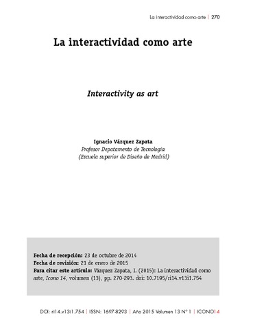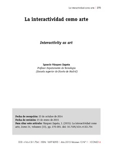 Desde los inicios del siglo XX la tecnología ha tenido una influencia creciente sobre la actividad artística y la expresión creativa. En la era digital la interactividad ha abierto a muchos artistas y técnicos la posibilidad de realizar obras en las que la interactividad constituye el componente fundamental de la obra. Los principios que determinan este tipo de relación entre artista y espectador tienen que ver con las posibilidades tecnológicas pero también con la forma en que contemplamos la obra de arte.