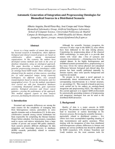 | Título: | Automatic Generation of Integration and Preprocessing Ontologies for Biomedical Sources in a Distributed Scenario |