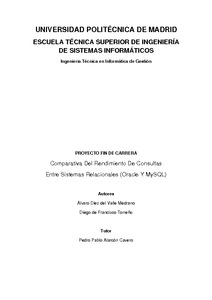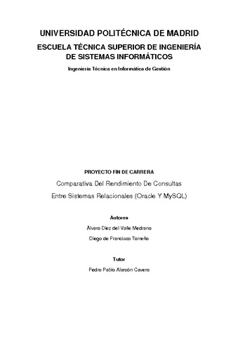 Este Proyecto Fin de Carrera (PFC) aborda un tema importante para las empresas y para el mundo de la informática en general, como es la comparativa entre sistemas gestores de bases de datos relacionales (SGBDR). El desarrollo de este PFC se centra en la definición de un proceso benchmark para dos SGBDR que tienen versiones de acceso libre: Oracle y MySQL.