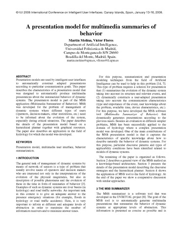 Presentation models are used by intelligent user interfaces to automatically construct adapted presentations according to particular communication goals. This paper describes the characteristics of a presentation model that was designed to automatically produce multimedia presentations about the summarized behavior of dynamic systems. The presentation model is part of the MSB application (Multimedia Summarizer of Behavior). MSB was developed for the problem of management of dynamic systems where different types of users (operators, decision-makers, other institutions, etc.) need to be informed about the evolution of the system, especially during critical situations. The paper describes the details of the presentation model based on a hierarchical planner together with graphical resources. The paper also describes an application in the field of hydrology for which the model was developed.