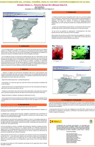 - Un Sistema de Información Geográfica (SIG o GIS, en su acrónimo inglés) es una integración organizada de hardware, software, datos geográficos y personal, diseñado para capturar, almacenar, manipular, analizar y desplegar en todas sus formas la información geográficamente referenciada con el fin de resolver problemas complejos de planificación y gestión. - Los SIG`s son herramientas que permiten la incorporación de información de diferentes fuentes, además de la visualización y control de los datos. -Es así como se presenta el subproyecto “Caracterización del litoral español para el cultivo y aprovechamiento de algas”. Este proyecto se enmarca en el Plan Nacional de Investigación Científica, Desarrollo e Innovación Tecnológica (I+D+I 2004-2007) convocado por el Ministerio de Medio Ambiente y Medio Rural y Marino.