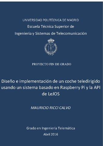 The current final year project is part of the T>SIC of Telematics Engineering and Electronics Department from ETSIST-UPM research project being carried out in order to design and develop decision making support system that will allow professionals working in primary schools to detect an early possible cognitive impairment in children of 5 to 8 years old. This research project is named EDUCERE (Ecosistema de Detección Ubicua, atenCión y Estimulación tempRana para niños con trastornos del dEsarrollo). Its aim is to promote the integral health by improving prevention and early intervention in child development. In order to achieve this goal, several games have been developed so as to evaluate child performance in different areas. One of the games that is being developed uses Lego MINDSTORMS robot with leJOS API. This game is about moving a robot on a board using a smartphone. The child controls the application running on the phone, which simulates a joystick that is able to send motion commands to the robot. The application which receives the phone orders is then executed by the robot. It will be also responsible for storing all the information needed to study, a posteriori, all about the child’s behaviour during the game. A maze picture with blocks of different colours is shown on the board. These colour blocks belong to the game strategy. Therefore, the robot has to always recognize the current colour of the board. Since Lego MINDSTORMS system is quite expensive (around 500€), a proof of concept has been considered in order to demonstrate that it is possible to obtain an equivalent Lego robot system that can run the same application. The success of this proof of concept will allow reducing the cost of the robot and eliminate many of the restrictions that Lego system has. This final year project will focus on the development of a car that will be capable of running the same application developed for the games than run on Lego system. The project will have these action lines: • Selection of hardware components that will allow creating a remote control car that can replace the Lego robot. An embedded system based on Raspberry Pi will be used, which will allow reducing the final cost of the product compared with Lego system and will also increase system performance. • Rewriting part of the leJOS API used in the application of Lego in order to run the same software created for that game.