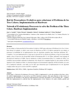 En este trabajo se diseña una Red de Procesadores Evolutivos (NEP) para solucionar el Problema de los Tres Colores. Para obtener el resultado, se utilizó como recurso de Hardware un FPGA. El objetivo principal de este trabajo, es demostrar la factibilidad de la implementación física de algoritmos paralelos para solucionar problemas NP ? Completos. Con esta implementación se logra que la ejecución de la solución al problema se haga de forma fiable, rápida y eficaz. El proyecto fue desarrollado usando la herramienta ISE 12.1 de Xilinx, utilizando como lenguaje de descripción de hardware al VHDL. Para la simulación se utilizó la herramienta ISim 12.1, también de Xilinx. Los resultados fueron probados utilizando la plataforma Atlys Board de la compañía Digilent la cual contiene un FPGA Spartan-6 LX45, también de Xilinx. Se muestran imágenes de la herramienta empleada, del Kit de Pruebas, así como de la simulación realizada y una tabla con los datos que demuestran que la implementación de este algoritmo complejo utilizó muy pocos recursos del FPGA empleado.