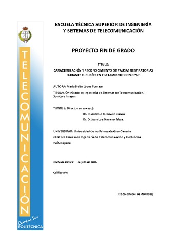 El Trabajo Fin de Grado (TFG), titulado, “Caracterización y reconocimiento de pausas respiratorias durante el sueño en tratamiento con CPAP” forma parte una importante línea de investigación que se lleva junto con doctores de la Unidad del Sueño que está en el Hospital Universitario de Gran Canaria Doctor Negrín”, sobre el desarrollo de herramientas de ayuda para el diagnóstico y tratamiento del Síndrome de Apnea Hipo apnea Obstructiva del Sueño (SAHOS). Es en esta Unidad donde mediante polisomnografías, se obtienen los datos necesarios para diagnosticar a las personas que padecen SAHOS. Es decir que sufren paradas involuntarias de respiración mientras duermen. Uno de los tratamientos más eficaces para combatir el SAHOS, es el tratamiento a través de CPAP (Continuous Positive Airway Pressure) que consiste en bombear aire bajo presión dentro de la vía respiratoria, manteniendo la tráquea abierta. Uno de los objetivos de este TFG es evaluar cómo el tratamiento de SAHOS con CPAP ha favorecido o no la mejora de la calidad de vida del paciente como consecuencia de la disminución o, en el mejor de los casos, desaparición de la enfermedad. A partir de esa perspectiva, se da una Visión General (Cap 1) de la enfermedad, sus síntomas, causas, y consecuencias tanto para el paciente, como para la sociedad, y a continuación, su diagnóstico y tratamiento (Cap 2). Así mismo, se pone de manifiesto los procesos de investigación y desarrollo previos, en los cuales se ha basado este proyecto. En el siguiente bloque (Cap 3), podrá encontrar el desarrollo particular de este TFG. Se parte de una base de datos nueva, con las señales polisomnográficas de pacientes enfermos con tres niveles de severidad de la enfermedad, antes y después del tratamiento. Nótese que el primer nivel de complejidad empieza por tratar con una base de datos que nadie ha analizado previamente. A continuación, se trabaja sobre las características de las señales. De trabajos previos, sabemos qué señales son determinantes para conocer el grado de severidad de la enfermedad. Estas señales son: la saturación de oxígeno en sangre y el electrocardiograma. Una vez se han extraído dichas señales se hace un análisis de cuáles son las características de interés en la detección de SAHOS (Cap 4). Los métodos de extracción de características se dividen en tres grupos principales: temporales, frecuenciales y transformados. El siguiente paso es un análisis estadístico de las características extraídas, y para terminar con este bloque se clasifican las señales, de tal manera que se pueda reconocer, si existe o no existe Apnea en el paciente que se analiza.