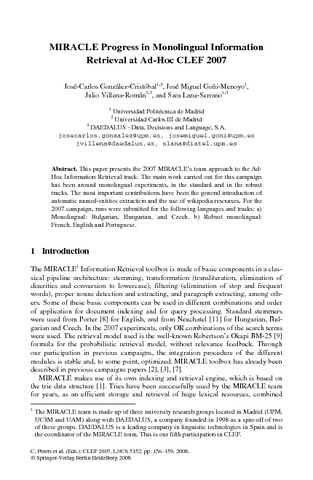 | Título: | MIRACLE Progress in Monolingual Information Retrieval at Ad-Hoc CLEF 2007 |