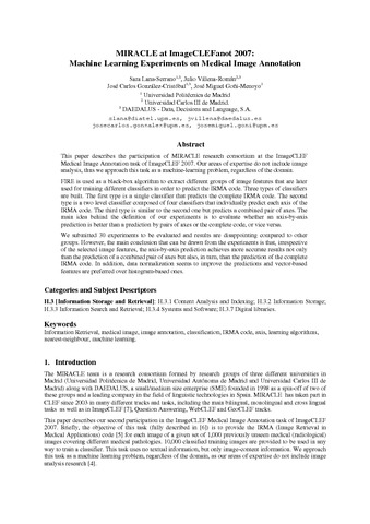 | Título: | MIRACLE at ImageCLEFanot 2007: Machine Learning Experiments on Medical Image Annotation |