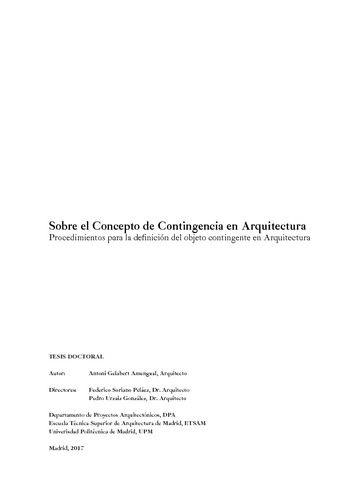 El Diccionario Filosófico de Cambridge, en su segunda edición editada por Robert Audi en 1999, define lo con¬tingente como aquello que no es ni imposible ni necesario. El término contingencia se refiere, por tanto, a aquello que, pese a reunir todas las condiciones necesarias para suceder, puede acabar por no ocurrir. En la misma entra¬da del diccionario, más adelante se afirma que el concepto es sin duda aplicable a proposiciones, estados o eventos, pero se pone en cuestión que podamos referirnos a objetos contingentes. La investigación que se desarrolla a continuación bajo el título Sobre el Concepto de Contingencia en Arquitectura. Procedimientos para la definición del objeto contingente en Arquitectura pretende demostrar que el concepto de contingencia es aplicable también a objetos. Más concretamente, el trabajo trata de exponer cómo la construcción de esos objetos contingentes ha sido tarea fundamental de la práctica arquitectónica internacional más relevante de los últimos 30 años, durante las que oficinas alrededor de todo el mundo han proyectado desde la consciencia de la aleatoriedad de los entornos en lo que su producción se emplazaba. Desde principios de la década de los años 40 del siglo XX el tiempo pasó a ser una cuestión inevitable para la Arquitectura. La publicación de Espacio, Tiempo y Arquitectura por Sigfried Giedion, que podemos considerar hito en la construcción de un reconocimiento explícito al peso de lo temporal, en realidad no hacía más que res-paldar la actitud temerosa con la que la arquitectura se estaba aproximando a la cuestión, tratando de domesticar el tiempo en la interacción con su producción. El caso de Le Corbusier y su promenade architecturale resulta paradigmático en este sentido, y retrata la relación con el tiempo de un arquitecto que predicó en uno de sus mani¬fiestos más significativos la ‘expulsión de las presencias contingentes’ en la construcción del espacio más elevado. Sin embargo el tránsito entre la década de los 80 y los 90 del mismo siglo trajo consigo una nueva actitud frente a la incertidumbre que ya introdujo lo temporal con todas sus consecuencias en el diseño del objeto arquitectónico. La arquitectura ha desarrollado desde entonces una aproximación que reconoce lo eventual como una de las ca¬racterísticas que define de forma más significativa el entorno en el que trabaja. Desde esa posición, las últimas décadas han visto desarrollarse prácticas que han hecho frente a ello no sólo sin renunciar a la condición objetual de su producción sino reforzándola, en un movimiento paradójico si atendemos a las reticencias expuestas al inicio. La investigación se aproxima a esta producción, ampliamente divulgada, con una metodología que se deriva de una lectura intencionada de la obra de Richard Rorty Contingencia, ironía y solidaridad. En el primer apartado del primer capítulo de su obra, titulado ‘La contingencia del lenguaje’, se expone cómo a través de la acción de redescribir repetidamente algo aparentemente conocido, el lenguaje es capaz de señalar un nuevo interés y una nueva forma de proceder vinculada. La propiedad dúctil del lenguaje permite utilizarlo en la construcción de ese nuevo campo a partir de la observación tangencial de prácticas sobradamente conocidas. De esta forma, se desarrolla un estudio de casos agrupado en un ‘Manual de arquitectura contingente’ que recoge una muestra significativa de arquitecturas cuyo trato con la incertidumbre resulta especialmente relevante para el marco de interés definido en la tesis. El manual está ordenado según los procedimientos que el estudio ha revelado útiles para la definición de cada uno de esos objetos contingentes, que son transferidos a la arquitectura desde el cuerpo de conocimiento empresarial dedicado a la elaboración de los ‘planes de contingencia’. El manual recoge prácticas extensamente difundidas como las de OMA, Lacaton & Vassal, SANAA (también tanto Kazuyo Sejima como Ryue Nishizawa en su práctica por separado), Diller Scofidio, OFFICE, Sou Fu¬jimoto, Atelier Bow-Wow o incluso de artistas trabajando en propuestas radicalmente espaciales (y por tanto arquitectónicas) como Olafur Eliasson o Ann Veronica Janssens. Sus trabajos son vueltos a describir desde la construcción que proponen de objetos contingentes, y ordenados a través de las cuatro estrategias de continuidad que los ‘planes de contingencia’ proponen: centro frío, centro caliente, centro espejo y centro móvil. Todo ello para construir una evidencia práctica de la posibilidad del objeto contingente en Arquitectura. ---------- ABSTRACT---------- The Philosophical Dictionary of Cambridge, in its second edition edited by Robert Audi in 1999, defines contingent as that which is neither impossible nor necessary. The term contingency refers, therefore, to what despite meeting all the necessary conditions to happen, may end up not occurring. In the same entry of the dictionary, it is affirmed later that the concept is certainly applicable to propositions, states or events, but it is put in question that it can refer to contingent objects. The research expounded on below under the title On the Concept of Contingency in Architecture. Procedures for the definition of the contingent object in Architecture aims to demonstrate that the concept of contingency is also applicable to objects. More specifically, the thesis tries to explain how the construction of these contingent objects has been a fundamental task for the most relevant international architectural practices during the last 30 years, in which offices around the world they have projected aware of the randomness of the environments in which its production was located. From the beginning of the 1940s, time became an inevitable issue for Architecture. The publication of Space, Time and Architecture by Sigfried Giedion, which we can consider as a milestone in the cons