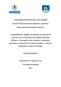 | Título: | Compatibilidad de Aphidius ervi (Haliday) parasitoide del vector de virosis en hortícolas Macrosiphum euphorbiae (Thomas) y Chrysoperla carnea (Stephens), depredador generalista, con nuevas barreras físicas selectivas y modernos plaguicidas en cultivos de lechuga |