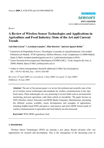 | Título: | A review of wireless sensor technologies and applications in agriculture and food industry: state of the art and current trends |