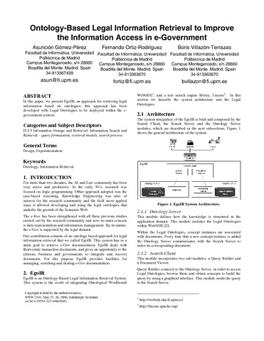 Ontology-Based Legal Information Retrieval to Improve the Information Access in e-Government.