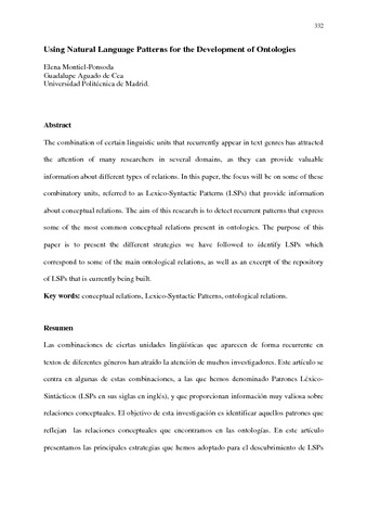 The combination of certain linguistic units that recurrently appear in text genres has attracted the attention of many researchers in several domains, as they can provide valuable information about different types of relations. In this paper, the focus will be on some of these combinatory units, referred to as Lexico-Syntactic Patterns (LSPs) that provide information about conceptual relations. The aim of this research is to detect recurrent patterns that express some of the most common conceptual relations present in ontologies. The purpose of this paper is to present the different strategies we have followed to identify LSPs which correspond to some of the main ontological relations, as well as an excerpt of the repository of LSPs that is currently being built.