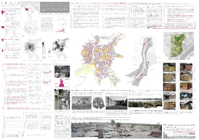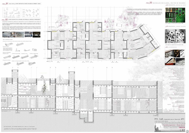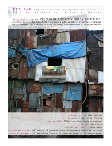 El proyecto se sitúa en Ahmedabad en el estado indio de Gujarat, donde el crecimiento de la población en los últimos 50 años ha desbordado con creces al planeamiento urbano de la ciudad. El mercado formal de la vivienda se ha visto incapaz de absorber los flujos migratorios y se han establecido numerosas barriadas por toda la ciudad. Estas bolsas de pobreza y precariedad absorbidas en la trama formal de la ciudad, no son una solución deseable ni apropiada, son resultado de la falta de estrategias políticas y de planeamiento, pero por otra parte, constituyen su propia respuesta frente a la problemática de escasez de vivienda frente a las cuales las instituciones públicas se ven desbordadas. El proyecto se centra en la barriada de Vadaj, al norte y en la margen izquierda del río Sabarmati donde ha crecido a lo largo de los últimos 50 anos. Esta propuesta de viviendas nace a partir de un proyecto de una ONG local para realojar a 20 familias en el margen este de la barriada y la controvertida propuesta de la municipalidad de desarrollar un parque ‘atractivo para la ciudad’ en este emplazamiento que supondría el desalojo progresivo de la mayor parte de sus habitantes. Se propone conciliar ambas posiciones, proponiendo prototipos de vivienda para el borde precario de la barriada que sustituyan las infraviviendas pero compatibles con un parque fluvial que funcione a modo de reclamo tanto para el resto de la ciudad y para los actuales residentes del asentamiento. La recogida de datos de las familias se realizó a través de datos secundarios proporcionados por la ONG y datos primarios durante el periodo de trabajo de campo. Esta información permitió el levantamiento de planos de la población objetivo y el acercamiento al tipo de vivienda, su organización en el terreno, datos de superficies, materiales actividades productivas realizadas por los residentes en el entorno de la vivienda etc. La propuesta de viviendas se centra pues en la sucesión de espacios habitacionales de crecimiento progresivo con módulos para infraestructuras. El resultado es un sistema y prototipo de viviendas semilla que aportan las necesidades básicas con posibilidad de extensión, crecimiento y mejora de la vivienda de manera progresiva. En cuanto a la escala urbana, los prototipos de agrupación de viviendas se organizan a modo de manzanas abiertas hacia el parque. El sistema constructivo y estructural de muros quebrados de bloques de hormigón y cenizas volantes que se propone se basa principalmente en dos subsistemas: por una parte, una adaptación del sistema tabibloc desarrollado por los arquitectos Ricardo Aroca y Antonio Vázquez de Castro, y por otro, bovedillas de arco carpanel de ferrocemento para los forjados. La disposición de los muros aseguran la estabilidad del edificio, un arriostramiento suficiente en caso de sismo y albergan los servicios: saneamiento, puntos de agua, escaleras, etc. La construcción con bloques de hormigón se está imponiendo incluso en países de tradición ladrillera por las facilidades que presentan los procesos de fraguado respecto a los procesos de cocción de la cerámica. Ambos sistemas son de prefabricación ligera. Las dimensiones de las piezas aumentan hasta el límite de manipulación. Están enfocados a la producción a pie de obra, para reducir costos. Este mecano constructivo de fácil comprensión, asimilable y divulgable, busca, en palabras e Ricardo Aroca: “desbloquear el conocimiento científico del sistema de las reducidas castas de los “expertos” o “técnicos” y hacerlos asequible a todos”, es decir que apuesta por la transferencia de conocimientos y técnicas apropiadas y apropiables. El último sistema constructivo, para aquellas partes blandas del ‘molusco’, es decir: los paramentos no portantes de las viviendas, tanto fachada como paramentos interiores, se basa en el reciclaje: materiales de desecho reciclados en elementos constructivos atractivos. El ayuntamiento es incapaz de gestionar las toneladas de basura producidas en la ciudad, muchas de las familias de las barriadas se encargan de recoger, seleccionar y revender las basuras como parte de su economía informal. Finalmente, de las instalaciones se podría destacar que se ha hecho especial interés en la importancia de la captación y acumulación del agua de pluviales. Hoy en día en Ahmedabad el 25 por ciento de la población consume el 90 por ciento del agua, es decir, el 75 por ciento se debe conformar con el 10 por ciento del agua de la red general y en horarios muy restringidos - 2-3 horas al día. La separación de aguas grises para su tratamiento con plantas anaeróbicas y reutilización (aunque no para consumo) y la utilización de las aguas fecales para una planta de biogás son otras de las instalaciones propuestas.