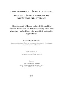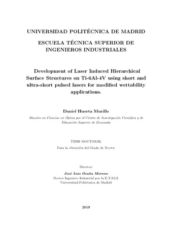 En esta tesis, se investiga la viabilidad de la escritura directa por láser para la creación de superficies funcionales con una mejor humectabilidad en la aleación de titanio TÍ-6A1-4V. La técnica de escritura directa por láser se empleó utilizando una estación de trabajo de láser pulsado de nanosegundos UV en el Centro de láser de la UPM. Las microestructuras creadas consisten en micro-pilares de forma cuadrada con diferentes longitudes (15 a 50 fim de ancho, 2-10 fim de altura), que se pueden variar con una resolución micrométrica. Los pilares fabricados con láser de nanosegundos exhiben una estructura con una forma cerrada en la parte superior como resultado del efecto térmico que se produce cuando se trabaja con láseres de nanosegundos, moviendo material fundido que se re-solidifica a la periferia de los micro-pilares. Estas estructuras han demostrado ser beneficiosas para el desarrollo de superficies hidrófobas en metales. La morfología de la superficie del área irradiada se caracterizó con microscopía electrónica de barrido y microscopía confocal. Adicionalmente, se empleó la técnica de texturizado mediante interferencia directa de láser, utilizando un láser de pulsos de picosegundo para crear microestructuras periódicas con formas de línea y pilar, con la ayuda y colaboración del Instituto Fraunhofer en Dresde, Alemania. En un proceso de dos pasos, se realizó una segunda irradiación con láser en las mismas superficies para crear pilares periódicos con un período espacial de 2.6 fim. La estructura generada en la superficie es uniforme en toda el área procesada, mostrando un conjunto periódico de micro-pilares con una profundidad promedio de 0.9 fim tanto en la dirección vertical como horizontal y una profundidad promedio de 1.5 fim en el máximo de interferencia. La combinación de estas dos técnicas de procesamiento por láser permite la creación de estructuras jerárquicas bien definidas. En colaboración con la Universidad de Birmingham, la formación de LIPSS se creó en la superficie de las muestras de TÍ-6A1-4V, utilizando un láser IR de pulsos de femtosegundos con la técnica de escritura directa por láser. Los LIPSS de baja frecuencia espacial de femtosegundos se generaron en la parte superior de la estructura generadas con el láser de nanosegundos para crear una estructura de escala dual. El proceso de femtosegundo está libre de efectos térmicos, lo que significa que las estructuras fabricadas previamente no se vieron afectadas por este segundo proceso de láser. Los LIPSS generados muestran estructuras auto-organizadas de manera muy uniforme con un período espacial de aproximadamente 810 nm. La superficie final muestra una rugosidad de doble escala, lo que proporciona un método exitoso para generar estructuras jerárquicas. Se realizaron mediciones estáticas de los ángulos de contacto para analizar el comportamiento de humectabilidad de las estructuras. Para todos los procesos con láser, las muestras fueron hidrofílicas inmediatamente después del procesamiento laser. Sin embargo, con el envejecimiento natural se observó un aumento en el ángulo de contacto estático. Empleando dos métodos de almacenamiento diferentes, se realizó una investigación de la importancia de las condiciones de almacenamiento en este proceso. Las muestras se mantuvieron en dos condiciones de almacenamiento diferentes: expuestas al aire ambiente y dentro de bolsas de polietileno. Se encontró que las bolsas de polietileno son beneficiosas para el envejecimiento de la superficie de las superficies de titanio fabricadas con láser, disminuyendo el tiempo de envejecimiento necesario para ser hidrofóbicas en comparación con el envejecimiento por exposición al aire ambiente. Las topografías jerárquicas mostraron una mayor repelencia al agua en comparación con las estructuras no jerárquicas. Especialmente, las estructuras jerárquicas alcanzaron un estado hidrofóbico con un ángulo de contacto del agua de más de 160 ° después de 3 semanas de almacenamiento en bolsas de polietileno, en comparación con las superficies jerárquicas mantenidas en el aire que mostraron un ángulo de contacto de alrededor de 120 °. Espectroscopia foto-electrónica de rayos X se utilizó para analizar la composición química de las muestras almacenadas en diferentes condiciones. Los resultados indican oxidación en las zonas tratadas, mostrando un claro aumento en la concentración total de oxígeno en comparación con la muestra de referencia. Entre los compuestos de oxígeno, se observó una clara diferencia en el contenido relativo de moléculas de agua entre muestras con las mismas estructuras mantenidas en dos condiciones de almacenamiento diferentes. Para el caso de la muestra mantenida en el aire, se detectaron moléculas de agua, mientras que para el caso de la bolsa de polietileno, que muestra el ángulo de contacto más alto, no se encontraron rastros de moléculas de agua. Además, el análisis detallado de los espectros de C para las muestras procesadas mostró trazas de varios compuestos de carbonos polares y no polares, siendo la muestra que se mantuvo en una bolsa de polietileno quien muestra la concentración más baja de moléculas polares, la cual también mostró el ángulo de contacto más alto. Los resultados indican que la ausencia de moléculas polares afecta mucho la humectabilidad de la superficie. Adicionalmente, se estudió la resistencia a la corrosión de las muestras procesadas. Se realizaron estudios de polarización lineal en las estructuras fabricadas para investigar el comportamiento de resistencia a la corrosión de los micro-pilares fabricados por escritura directa por láser y las estructuras jerárquicas en una solución de 0.5 M de NaCl. Los resultados muestran que incluso si la densidad de la corriente de corrosión y el potencial de corrosión no son mejorados en gran medida por las estructuras creadas con nanosegundos