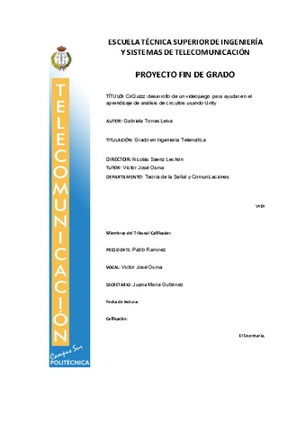 El laboratorio de Análisis de Circuitos es eminentemente práctico: montar circuitos en placas, tomar mediciones con un multímetro, simular con generadores de funciones y un osciloscopio, etc. Y para aprender y para adquirir las competencias del laboratorio hay que practicar, probar, experimentar y demás sinónimos. Aún siendo así, las sesiones de laboratorio son limitadas y los alumnos no tienen disponibilidad plena para usar el material de la escuela. Por otro lado, los alumnos de nuevo ingreso proceden de múltiples Itinerarios Educativos y se debe contemplar el hecho, que efectivamente ocurre, de que previo a la universidad no hayan recibido formación sobre circuitos eléctricos, ni por supuesto hayan montado algún circuito básico. Sumando estos dos problemas- falta de espacio, tiempo y material para practicar y falta de nociones básicas - y buscando posibles soluciones, surge una idea para mejorar el aprendizaje en el laboratorio: usar como complemento de enseñanza un videojuego que permita practicar los conceptos elementales. Se trata de un material de fácil acceso, reutilizable y llamativo para las nuevas generaciones. Aunque en el ámbito educativo no es una novedad, es más, se podría decir que está en auge, en el área del análisis de circuitos sí lo es, ya que existen cantidad de simuladores, pero no videojuegos como tal, y es que hay que diferenciar las herramientas de apoyo al estudio o los instrumentos de repaso, de los videojuegos. En este proyecto se desarrolla un videojuego. ¿Cómo se explica un concepto básico a través de un videojuego? ¿Cómo se traslada una idea a un videojuego? ¿Cómo se hace un videojuego? El resultado del proyecto se elabora a partir de buscar respuesta a estas preguntas y de adaptarlas a las particularidades del análisis de circuitos. Abstract: The laboratory workshop of Circuits Analysis is mostly practical: build circuits, take measurements, simulate with an oscilloscope, etc. And, in order to learn and acquire the competences needed to pass the lab, students have to practice, test, experiment and other synonyms. Even so, lab sessions are limited and students do not have full availability to use the resources. On the other hand, new students come from many different academic backgrounds and it must be considered the fact, which happens, that before University they may have not received any knowledge about electric circuits, nor build any basic circuit. The addition of those two issues- lack of space, time and resources to practice, and the deficiency of basic notions - and the search for possible solutions, results in an idea to improve the learning process of the laboratory: use as a complementary teaching tool, a videogame that allows students to practice the fundamentals. A videogame is easy to access, reusable, and interesting for new generations. Although in the educational field, using this type of tools is not a novelty, in the area of circuits analysis it is, since there are plenty of simulators but no videogame per se. How can we explain a basic concept throughout a videogame? How can we translate an idea into a videogame? How do we make videogames? The end of this project is developed by trying to find answers to these questions and somehow adapt them to the peculiarities of the circuit analysis.