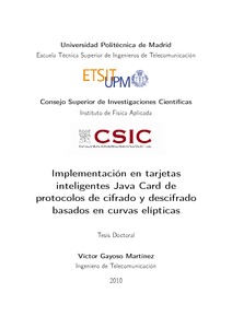 | Título: | Implementación en tarjetas inteligentes Java Card de protocolos de cifrado y descifrado basados en curvas elípticas |