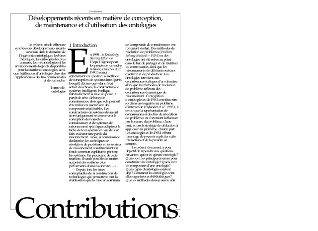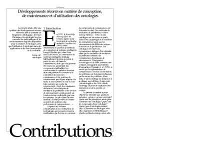 Le présent article offre une synthèse des développements récents survenus dans le domaine de l’ingénierie ontologique: les bases théoriques, les ontologies les plus connues, les méthodologies et les environnements logiciels disponibles pour la création d’ontologies, ainsi que l’utilisation d’ontologies dans des applications à des fins commerciales et de recherche.