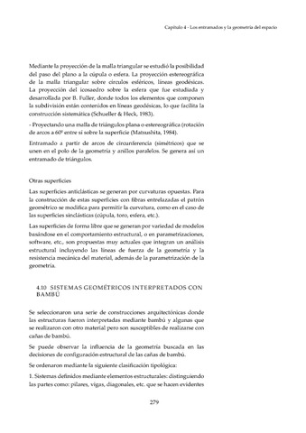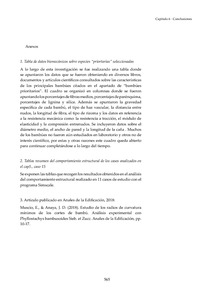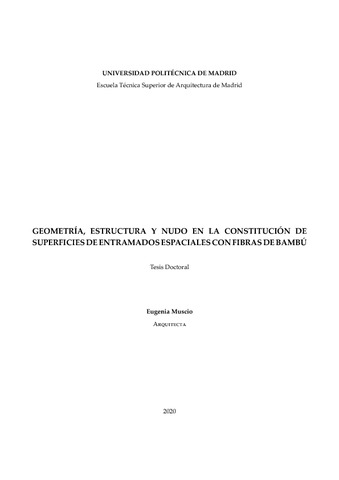La construcción de las arquitecturas contemporáneas se está caracterizando desde el comienzo de siglo XXI por la utilización de diseños definidos mediante superficies rígidas de geometrías complejas y formas libres. Esta Tesis Doctoral se plantea como Hipótesis el demostrar que tales superficies son susceptibles de resolverse mediante tejidos constituidos con fibras naturales de bambú (en esta tesis doctoral se considera fibra a la parte mínima del bambú obtenida a partir del corte para la configuración de entramados) obteniendo una solución constructiva con elevado nivel de resistencia, gran capacidad definición formal, cuya configuración como láminas estructurales ligeras se puedan resolver mediante elementos constructivos auto portantes, producidos con fibras de corte característico, patrones geométricos de tejido y condiciones del nudo de entrelazado. Y cuya capacidad de ensamblado permita la conformación de formas estructurales continuas mediante teselación geométrica. La utilización de materiales vegetales naturales como las fibras de bambú, que se define en este estudio como la parte mínima del bambú obtenida a partir del corte de la caña para conformar un entrelazado, en la construcción otorgan gran versatilidad de uso. Las características mecánicas de las superficies entramadas continuas y geometrías complejas rígidas obtenidas a partir de las fibras dependerán de las particularidades de la especie de bambú, el corte empleado y el patrón de entrelazado. Para la confirmación de la Hipótesis se estableció como objetivo identificar morfogenéticamente la relación entre especies de bambú, tipos de corte de bambú vinculados a patrones de entramado planos, definición de nudos de entramado y su capacidad de configurarse como superficies características continuas de geometrías de formas libres. Esta tesis plantea el estudio analítico de una de las más antiguas técnicas de unión de bambú como son los entramados. Tejidos que por fricción forman estructuras rígidas y ligeras. Son superficies armadas a partir de fibras obtenidas de los cortes del bambú con las que se obtienen diferentes resultados en función de la especie y la selección de los cortes. Se aborda el estudio de los tejidos con fibras de bambú, sus patrones geométricos de entrelazado y las geometrías admisibles para la constitución de superficies tejidas. El estudio analítico del entrelazado y de la geometría que da origen al tejido permiten conocer la posibilidad de realizar superficies de doble curvatura. Por otro lado, los cortes del bambú se relacionan directamente con el grado de flexibilidad de las fibras y la resistencia mecánica para realizar los entrelazados. En este estudio analítico se interpreta la relación entre la geometría de una superficie, el patrón geométrico de entrelazado y las características biomecánicas del corte de las fibras de bambú para establecer los criterios de estabilización de superficies de doble curvatura en función de la distancia de nudos de entrelazado de fibras, la densidad de fibras en el tejido y los tipos de corte del material definidos por su radio de curvatura mínimo admisible. La metodología de trabajo de esta investigación fue clave para llegar al objetivo de este estudio analítico. La metodología empleada se basa en un triedro que se define por tres aspectos como son la geometría, la estructura y la forma, que condicionan la capacidad de originar superficies. Puntos de análisis vinculados a los cortes en fibras del bambú, a su anatomía, a la disposición de las fibras para configurar un tejido y a los nudos de entramado. Se buscó relacionar y contrastar la información y los datos obtenidos mas significativos de cada uno de las partes que interfieren en la constitución de entramados espaciales con fibras de bambú estudiados en los diferentes capítulos. Se estudiaron las correspondencias entre datos dos a dos hasta obtener interrelaciones de hasta cuatro datos para llegar al objetivo planteado. Por último, se realizó un estudio de casos analizando del comportamiento mecánico mediante el programa Simscale que discretiza el volumen por el algoritmo OpenFoam, el cual al trabajar con uniones o intersecciones de líneas considera los nudos rígidos y fusiona el material en una única superficie. Suponiendo una estructura de fibras tejidas en equilibrio con nudos comprimidos que alcanzan la rigidez en esos puntos del entramado al conseguirse el equilibrio del conjunto de la estructura, se consideró que el nudo rígido representa la máxima fricción en el nudo de entramado. Se establece de esta forma la cualidad del problema que se plantea en esta investigación donde se identificó el valor de los aspectos relevantes para determinar la metodología que se puede, por lo tanto, extrapolar a cualquier otra familia. Una vez realizado el estudio de los aspectos que definen los criterios de configuración de una geometría compleja para la definición con un entramado de bambú se puede concluir que la selección del género y especie de bambú para el trabajo con tiras puede comenzarse a partir de la selección del tipo de rizoma (Paquimorfo o Leptomorfo) el cual otorga mayor o menor facilidad de corte en fibras. A continuación la información sobre el módulo de elasticidad, la distancia entre nudos de la caña y la longitud de fibras de la planta son factores que influyen en la respuesta mecánica de la tira de bambú y del entramado y a su vez influyen en la curvatura admisible de la fibra obtenida. La combinación de un mayor módulo de elasticidad, de entre nudos mas juntos en la planta y de poca longitud de fibras en la anatomía de la planta puede disminuir la flexibilidad de los cortes obtenidos, por lo tanto, disminuir la curvatura admisible. Por otro lado, se concluye que para constituir geometrías de doble curvatura sinclásticas los cortes de caña de 1/4 de caña, 1/8 de caña (cortes con men